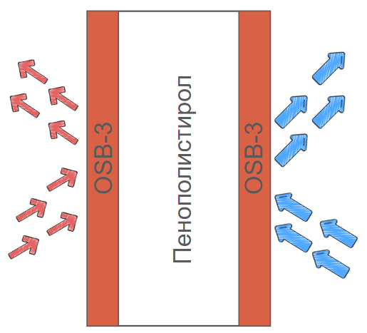 Верхний и нижний слой СИП-панели — это OSB-3. Его главные преимущества — это прочность и влагостойкость. Эти качества и позволяют дому быть прочным и не бояться никаких погодных условий и воды. Ведь OSB-3 не напитывает в себя влагу от слова совсем